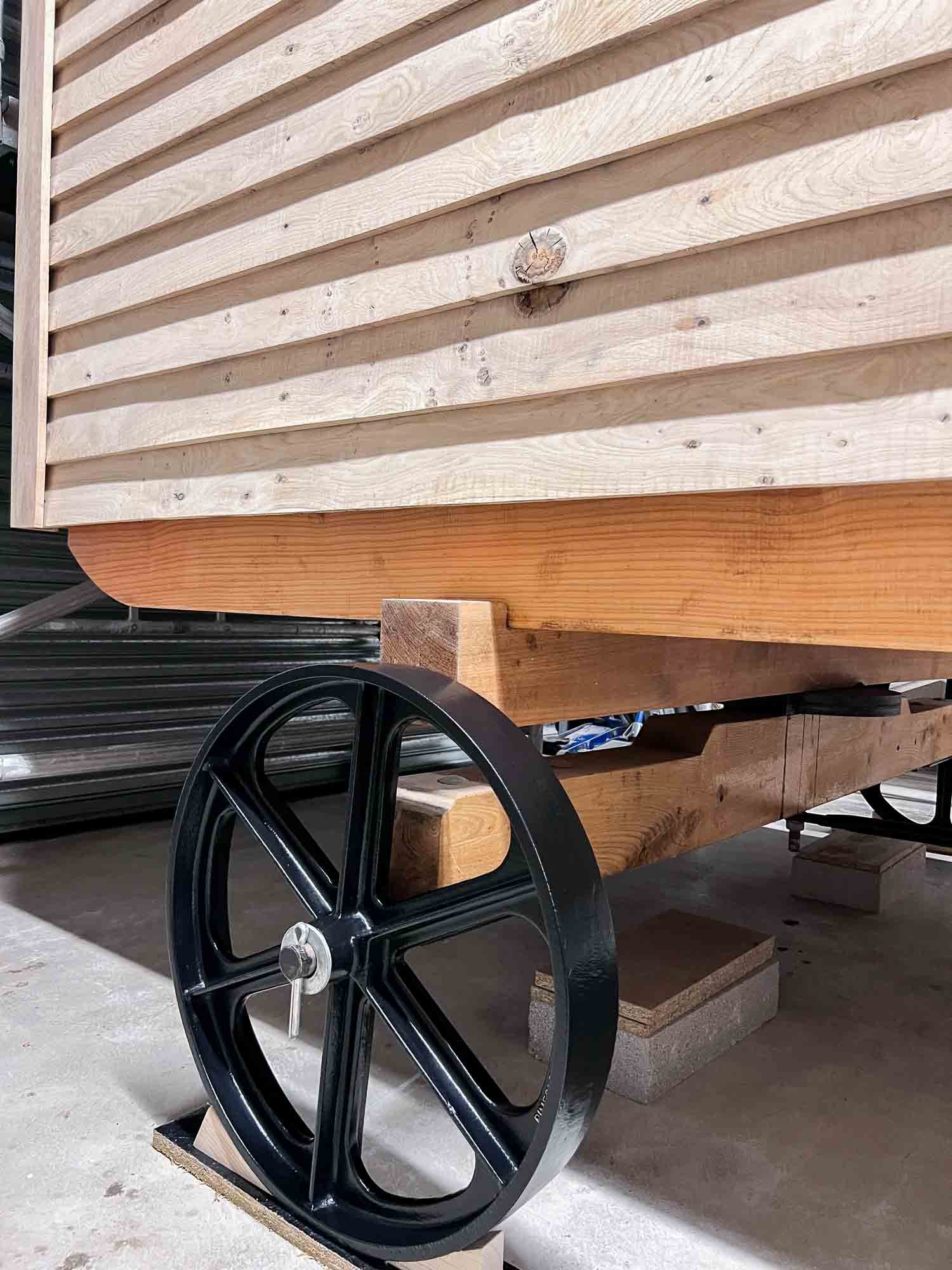 Cast iron wheels finished in black enamel paint, and embossed with the Pinfold Shepherd Huts brand.